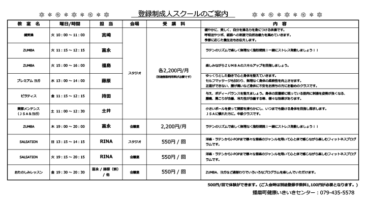 登録制成人スクール ※500円/回で体験可能です。(別途登録手数料1,100円が必要となります)